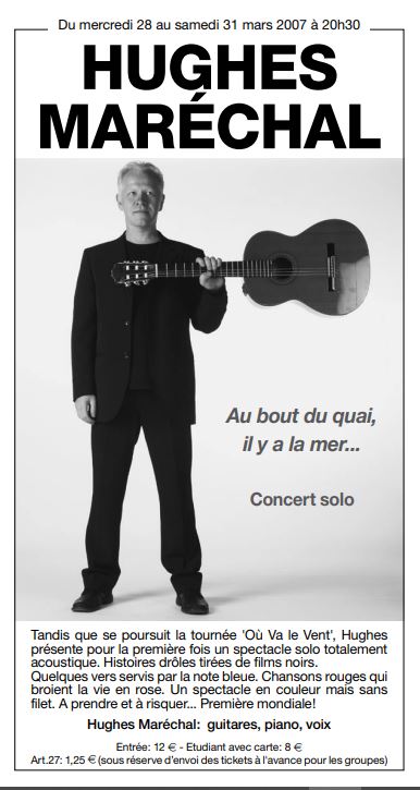 28 mars 2007 : Jusqu’au 31 mars, l’auteur, compositeur et interprète belge Hughes MARECHAL se produit sur scène à Bruxelles à La Samaritaine. L’artiste y présente pour la première fois un spectacle solo totalement acoustique où il s’accompagne à la guitare et au piano.