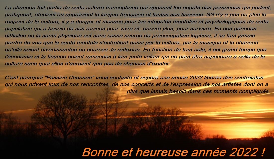 Il se veut un moyen d’établir un trait d’union entre artistes, organisateurs, journalistes, producteurs, diffuseurs et admirateurs passionnés. Il a pour but de suivre et de répercuter au mieux ce qui se passe dans le milieu de la chanson francophone quelle que soit son origine. Et, comme c’est vous aussi qui faites l’actualité, n’hésitez pas à nous faire connaître vos activités. Simplement en cliquant ci-dessus à gauche sur l’onglet « Nous contacter » (dans « Navigation ») ou ICI. Si l’envoi du courrier électronique ne fonctionne pas, n’hésitez pas à envoyer votre e-mail à l’adresse : info@passionchanson.net.