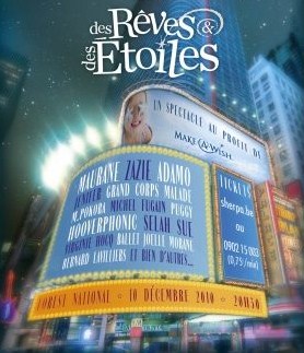 10 décembre 2010. Objet d’une captation pour la télévision belge (RTBF), la soirée accueillera, dès 20 h. 30, bon nombre d’artistes réputés et talentueux. Présenté par la marraine de l’association, Maurane, le spectacle proposera une affiche où l’on retrouve les noms de Zazie, Salvatore Adamo, Jenifer, Bernard Lavilliers, M. Pokora, Grand Corps Malade, Michel Fugain, Puggy, Hooverphonic, Selah Sue, Virginie Hocq, Michel Boujenah et du Ballet Joelle Morane.