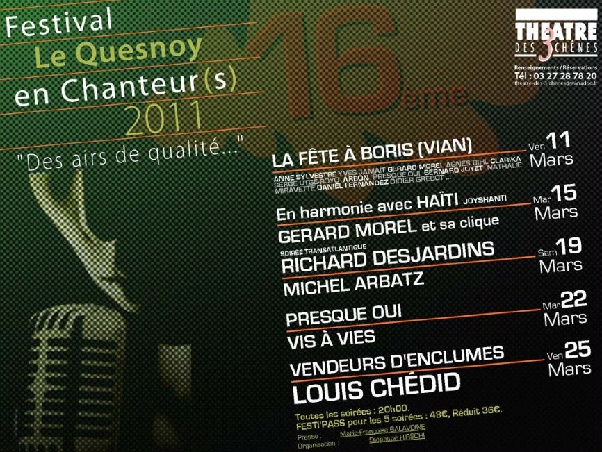 Située dans le Nord de la France, à quelques kilomètres de Valenciennes et de Bavay, la ville du Quesnoy accueille en 2011 la 16e édition du festival « Le Quesnoy en chanteurs ». Cette organisation fait une large place à la chanson française d’expression telle qu’on la pratique encore dans des endroits devenus beaucoup trop rares. Allez y applaudir les Brel, Brassens et Ferré d’aujourd’hui et de demain. Certains d’entre eux seront même réunis pour honorer le souvenir de Boris Vian dans un spectacle qui aura lieu le 11 mars. Pour en savoir plus, consultez donc l’affiche ci-dessous.