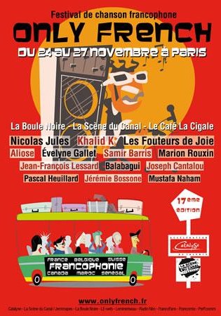 Pour sa 17ème édition, le festival « Only French » proposera cette année des formations en provenance de 3 continents : Europe (Belgique, France, Suisse), Afrique (Maroc, Sénégal) et Amérique (Canada). Avec un moteur plein de l’énergie la plus durable qui soit : la fraternité.Les jeudi 24, vendredi 25 et samedi 26 novembre, les concerts auront lieu à partir de 19 heures 15 à la « Boule Noire » et au café « La Cigale » qui se trouvent sur le boulevard Rochechouart, 120 et 124 (métro Anvers et Pigalle).