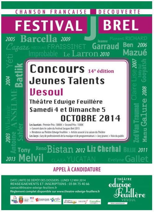 La 14e édition du Festival Jacques Brel aura lieu les 4 et 5 octobre 2014 à Vesoul. Dans ce cadre, un concours « Jeunes Talents » est mis sur pied. Au terme de cet appel à candidats, cinq artistes seront sélectionnés pour jouer le 4 et le 5 octobre prochains à Vesoul.Les artistes intéressés par ce concours doivent répondre à trois conditions de participation :