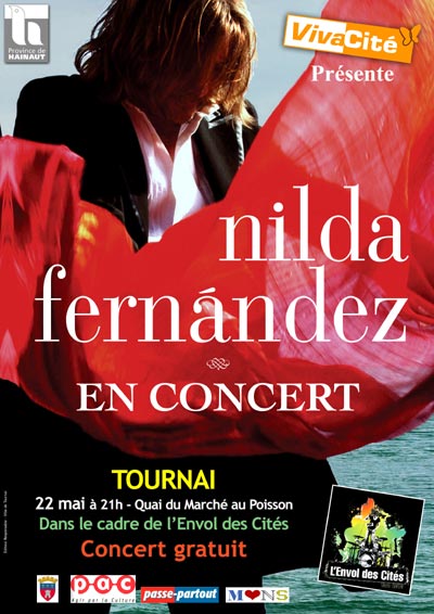 22 mai 2010 : Le concours de jeunes talents belges francophones « Envol des Cités » fait escale à Tournai avec, en invité exceptionnel, Nilda FERNANDEZ qui livre un concert gratuit sur les rives de l’Escaut. Pour cette cinquième édition, divers rendez-vous ont déjà eu lieu avec les publics de Charleroi (17 avril), Frameries (1er mai), La Louvière (15 mai) et d’autres sont fixés au 5 juin à Dour et à Braine-le-Comte le 12 juin. Quant à la finale, elle est prévue pour le 20 juin 2010 au théâtre royal de Mons. Seize artistes et groupes ont été sélectionnés pour ce périple musical. Et, même s’ils ne possèdent pas tous un répertoire francophone, voici leurs noms sans distinction de style musical : Dead Mouse, Socrade, Crispy, Fuckin’ Summer, Mary’s Revenge, Ripcode, AngezyA, La Familya, Mochélan, Tum Tum Tree, Universound, Fred Rinaldi Band, Aeryx, MamZ-L, Eve’s Apple et Kaf *k.