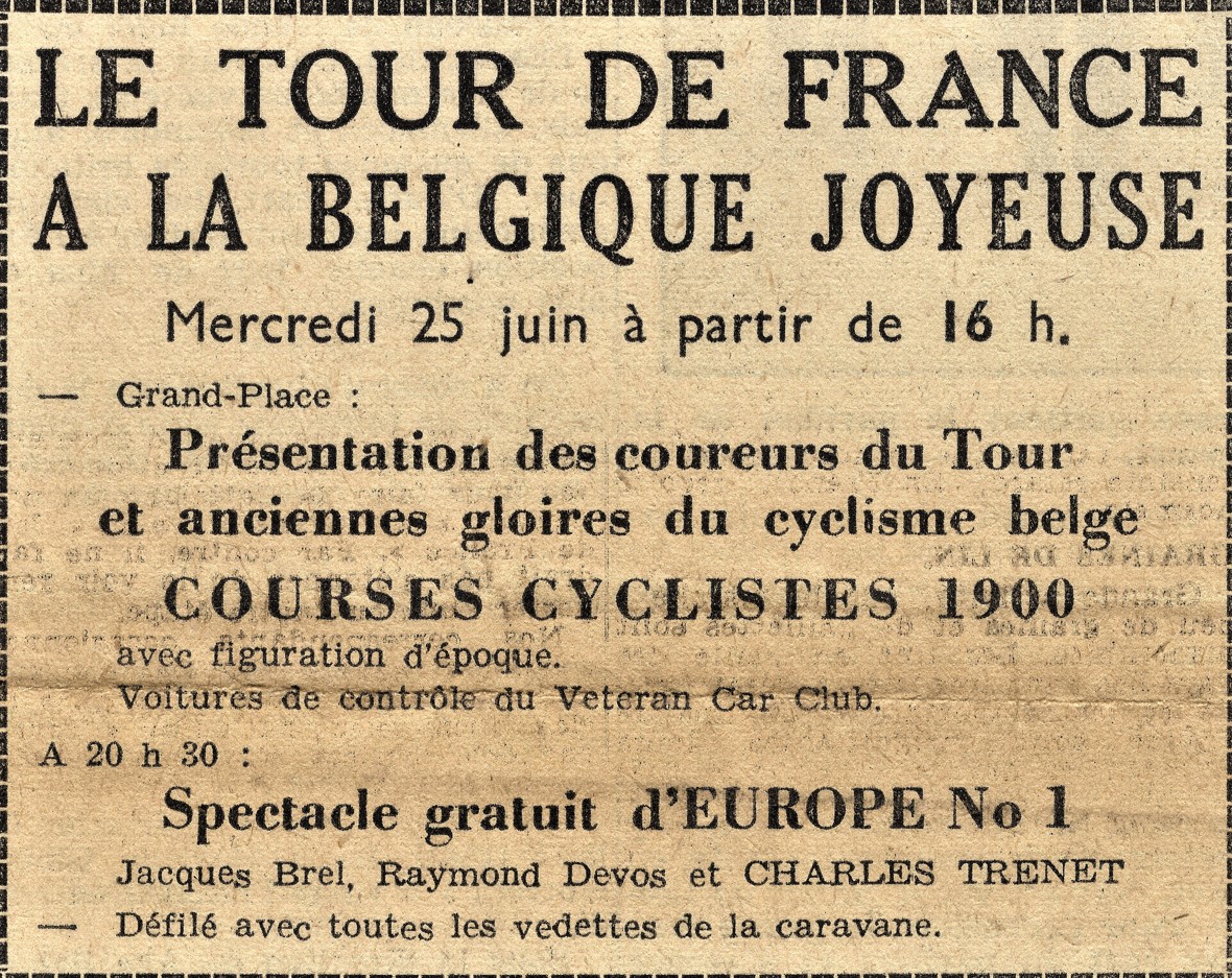 25 juin 1958 : Alors que l’Exposition Universelle bat son plein à Bruxelles, le lieu festif de l’événement, la Belgique Joyeuse, accueille, à partir de 16 heures, la présentation des coureurs et des équipes du Tour de France cycliste dont le départ est donné dans le cadre de la manifestation internationale. Et, pour l’occasion, un grand spectacle gratuit est proposé à 20 h. 30 par la radio périphérique française Europe 1 avec Jacques BREL, Raymond DEVOS et Charles TRENET dont le succès du moment est « Le jardin extraordinaire ».