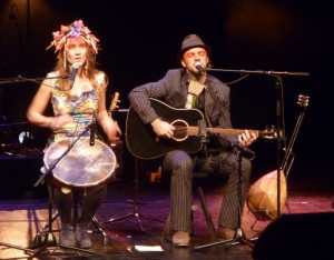 couple récolte des chansons et des instruments qu’ils mêlent à leurs propres compositions. Avec le cavaquinho brésilien, le bouzouki grec, la guitare ou le violon, leur musique