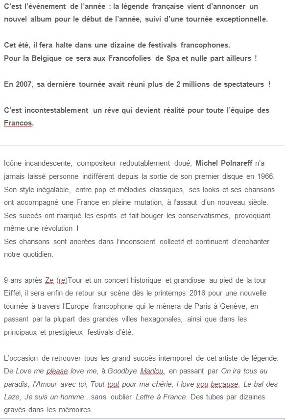 MICHEL POLNAREFF aux Francofolies de Spa 2016