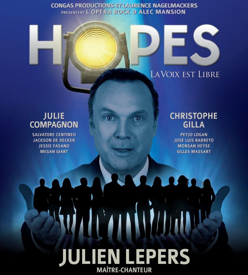 Hopes raconte l’histoire de deux jeunes artistes, interprétés par Julie Compagnon et Christophe Gilla, qui participent à un télécrochet. Leur rêve tourne en cauchemar à cause d’un terrible et horrible maître chanteur, incarné par Julien Lepers, qui aura l’occasion de jouer quelques notes de piano. Opéra-rock 100% belge signé Alec Mansion, le spectacle est chorégraphié par Fabien Ruiz qui a officié sur le tournage du film « The Artist ». C’est lorsqu’il était directeur musical de l’émission « The Voice Belgique qu’Alec Mansion a eu l’idée d’écrire le scénario. Il a alors composé 18 chansons volontairement dans des styles musicaux très différents. Dans un souci de faire émerger des talents belges parmi la mine d’artistes de qualité dont regorge la Belgique, le recrutement s’est effectué fait via le web. 250 artistes ont posé leur candidature, 180 ont été auditionnés lors d’un casting live et 18 chanteurs ont été retenus pour constituer la troupe de « Hopes ». Enfin, Hopes étant un opéra rock live, tous les musiciens sont sur le plateau et la mise en scène utilise des moyens inédits avec des décors en projection d’images 3D et du mapping.