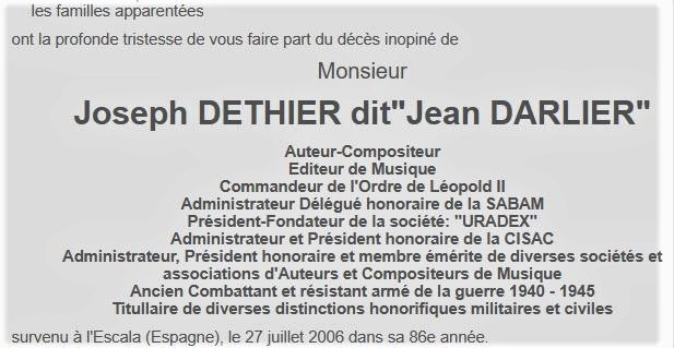 L’auteur, compositeur et éditeur de musique belge Jean DARLIER naît le 5 février 1920 à Theux sous le nom de Joseph Dethier. Passionné de musique dès son plus jeune âge, il se dirige vers des études en technologie à Liège en suivant des cours au conservatoire de Verviers. Pendant la seconde guerre mondiale, il se fait remarquer pour des faits de résistance face à l’ennemi. Et, dès la libération, quand il le peut, il compose des musiques, notamment de jazz, et se distingue, en 1950, en recevant le prix de la radio belge francophone. Petit à petit, il fréquente les milieux musicaux de Bruxelles.