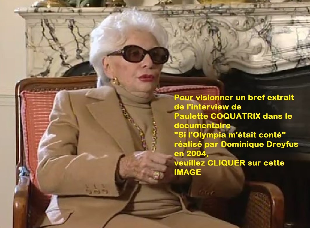 La costumière de théâtre et de cinéma française Paulette COQUATRIX naît le 26 avril 1916 à Paris sous le nom de Clara Paulette Possicelsky. Au début des années 1950, elle est créatrice de costumes pour les spectacles de la Comédie-Caumartin, dirigée par Bruno Coquatrix à partir de 1952. Elle se marie avec ce dernier et devient Paulette Coquatrix, l’épouse du directeur de l’Olympia de Paris à partir de 1954. À la mort de Bruno Coquatrix en 1979, elle hérite de l’Olympia à parts égales avec sa fille Patricia. Elle confie la direction générale du music-hall parisien à son neveu, Jean-Michel Boris, entré dans l’entreprise dès le début en 1954. En août 2001, Paulette vend la salle de spectacle au groupe Vivendi mais sa fille Patricia en assure la direction artistique jusqu’au mois de janvier 2002. C’est Arnaud Delbarre, fils du chanteur Raoul De Godewarsvelde, qui lui succède jusqu’au 30 juin 2015. Paulette Coquatrix décède le 28 mai 2018 à l’âge de 102 ans. Elle est inhumée au cimetière parisien du Père Lachaise auprès de son époux.